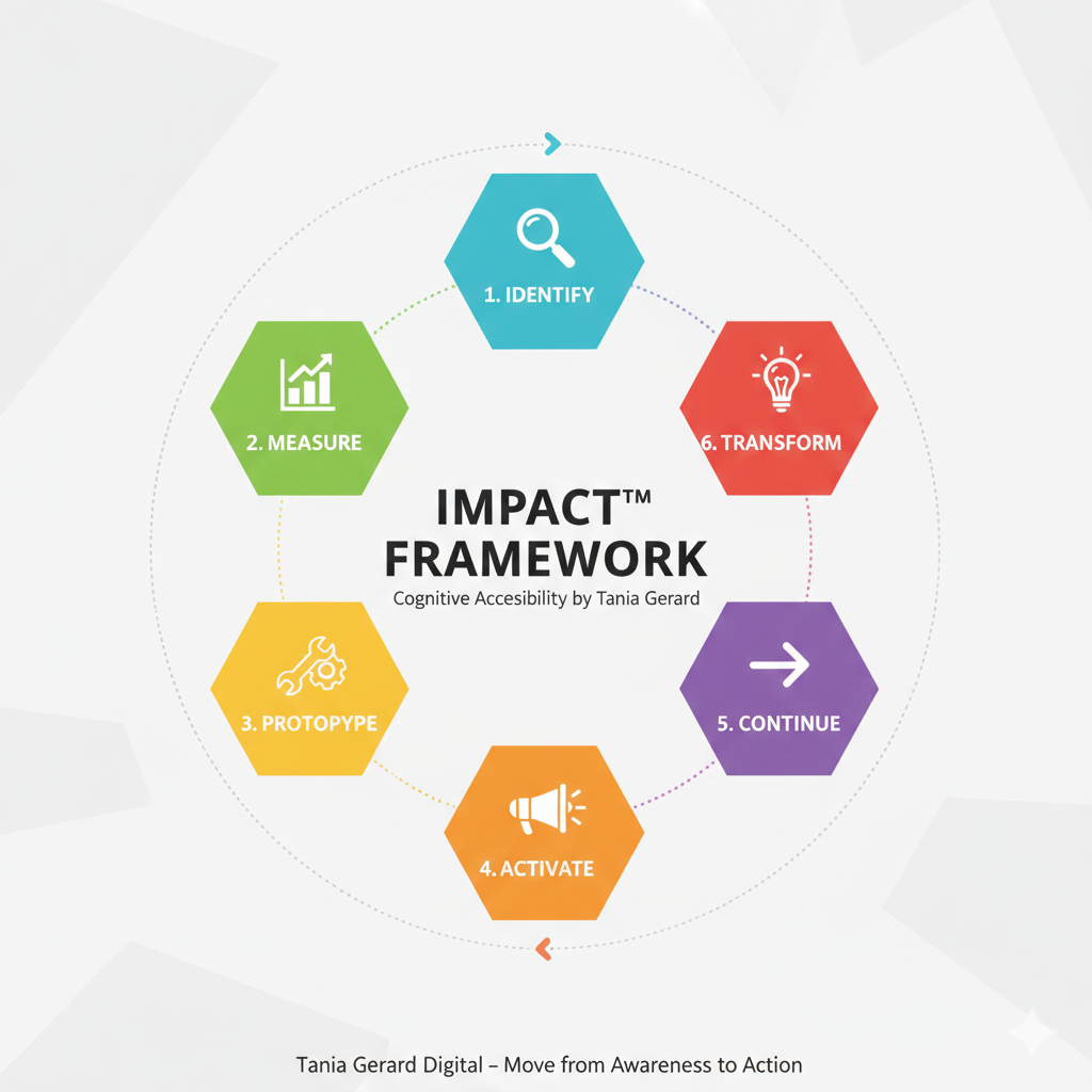 True inclusion requires Cognitive Accessibility. To bridge the gap between "accessible code" and "usable experiences," I developed the IMPACT™ Framework. This methodology is designed to move organizations beyond basic awareness into a data-driven, systematic transformation of their marketing and workplace systems.