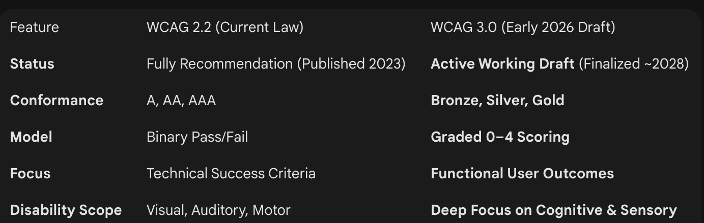 WCAG 3.0 changes the game with three major shifts:
